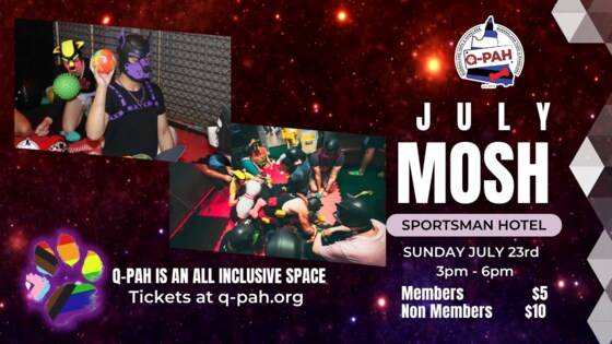 July 2023 MOSH We are now holding Mosh on the 4th Sunday of Every Month & at a new time!! $5 Members | $10 Non Members Calling all pup's & handlers to come on down to Mosh on Sunday July 23rd, doors open from 3pm - 6pm, and join us for Dinner Upstairs in Nellies Bar, Q-Pah has a table booked for all the Pups & Handlers who would like to join! GEAR IS NOT REQUIRED BUT WELCOME - Mosh Mats - Board Games - Lounge Spaces - Meet some new Pups - Reconnect with some you have missed Q-PAH events are open to adults 18+ of any gender or sexuality. Q-PAH events are non sexual, no bare bums or insertible tails.  Get a QPaH Membership: https://qpah.tidyhq.com/public/membership_levels