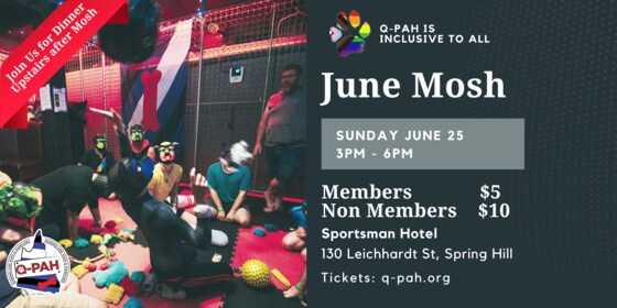 JUNE 2023 MOSH We are now holding Mosh on the 4th Sunday of Every Month & at a new time!! $5 Members | $10 Non Members Calling all pup's & handlers to come on down to Mosh on Sunday June 25, doors open from 3pm - 6pm, and join us for Dinner Upstairs in Nellies Bar, Q-Pah has a table booked for all the Pups & Handlers who would like to join! GEAR IS NOT REQUIRED BUT WELCOME - Mosh Mats - Board Games - Lounge Spaces - Meet some new Pups - Reconnect with some you have missed Q-PAH events are open to adults 18+ of any gender or sexuality. Q-PAH events are non sexual, no bare bums or insertible tails.  Get a QPaH Membership: https://qpah.tidyhq.com/public/membership_levels