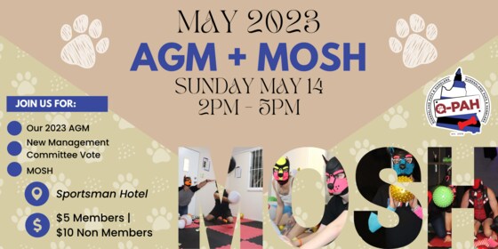 May 2023 MOSH + AGM Come and Join us for our 2023 AGM and Vote for Our New Management Committee  $5 Members | $10 Non Members Calling all pup's & handlers to come on down to Mosh on Sunday May 14. AGM Starts at 2pm, and is open to all financial members. Doors open and mosh starts from 2:30pm - 5pm. You must be a current Financial Member to attend AGM. GEAR IS NOT REQUIRED BUT WELCOME - Mosh Mats - Board Games - Lounge Spaces - Meet some new Pups - Reconnect with some you have missed Q-PAH events are open to adults 18+ of any gender or sexuality. Q-PAH events are non sexual, no bare bums or insertible tails.  Get a QPaH Membership: https://qpah.tidyhq.com/public/membership_levels