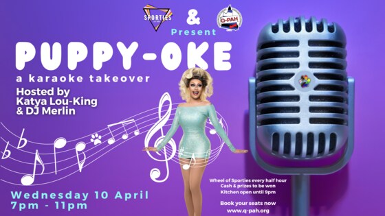 PUPPY-OKE Q-PAH is taking over the Karaoke @ Sporties on Wednesday 10 April!  Bring your Hoods and Singing Voices and show off your skills on stage!  Join us for dinner from 7pm!! Register your seat at the Q-PAH Table here with a free ticket!