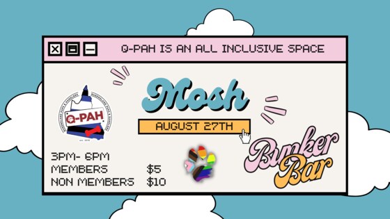 August 2023 MOSH We are now holding Mosh on the 4th Sunday of Every Month & at a new time!! $5 Members | $10 Non Members Calling all pup's & handlers to come on down to Mosh on Sunday August 27th, doors open from 3pm - 6pm, and join us for Dinner Upstairs in Nellies Bar, Q-Pah has a table booked for all the Pups & Handlers who would like to join! GEAR IS NOT REQUIRED BUT WELCOME - Mosh Mats - Board Games - Lounge Spaces - Meet some new Pups - Reconnect with some you have missed Q-PAH events are open to adults 18+ of any gender or sexuality. Q-PAH events are non sexual, no bare bums or insertible tails.  Get a QPaH Membership: https://qpah.tidyhq.com/public/membership_levels