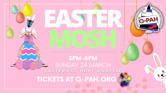 Easter is Upon Us! EASTER EGG HUNT & AN EASTER RAFFLE!!! Puppies..Chocolate? Well it's bound to be a good time! Fancy an easter egg hunt? or just want to chill out with your fave pup friends! Make sure to bring your bunny ears...the group photo will be so cute!! Sunday March 24th at 3PM Q-PAH will be hosting our Monthly Mosh! Come down to the bunker and enjoy a pup filled afternoon of moshing, chill out's and catch ups! We will even have an easter themed raffle!! Not a Member? Join today and get instant access to our Member Pricing! https://qpah.tidyhq.com/public/membership_levels TICKETS: MEMBERS $5 | NON MEMBERS $10 PLUS Join us for dinner after Mosh upstairs in Nellies Showroom with Top This Sunday's   We will have our usual Board Games, Mosh Mats and the Ball Pit (with some extra balls thanks to Santa Paws). Meet some new Pups and reconnect with some you have missed GEAR IS NOT REQUIRED BUT WELCOME Q-PAH events are open to adults 18+ of any gender or sexuality. Q-PAH events are non sexual, no bare bums or insertible tails.  We look forward to bouncing around with you!  Date: Sunday March 24th Time: 3pm - 6pm (folllowed by dinner upstairs with Drag Shows) Location: Sportsman Hotel, Bunker Bar,  124 Leichhardt St, Spring Hill, QLD 4000